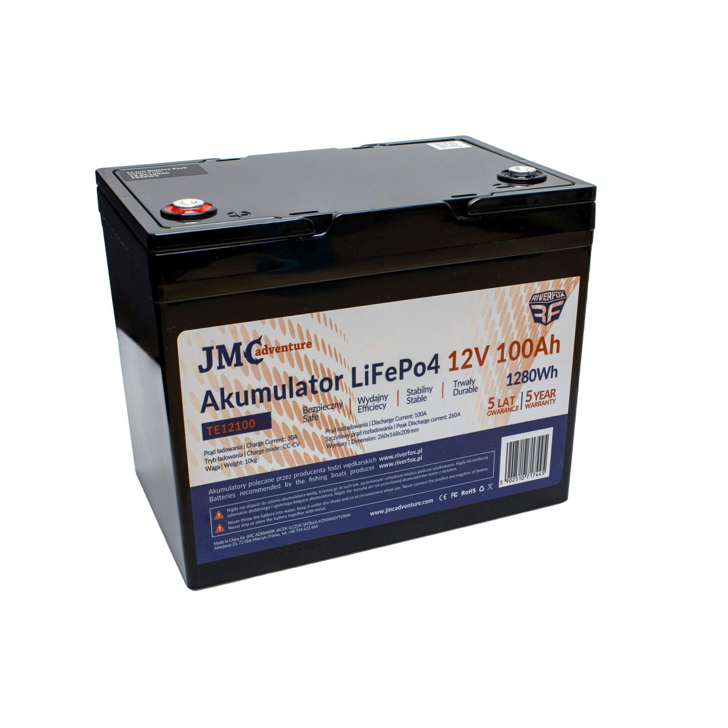 Lítiová batéria JMC ADVENTURE 12,8V 100Ah LiFePO4 odporúčaná výrobcom lode RIVERFOX pre hlboký cyklus vybíjania.