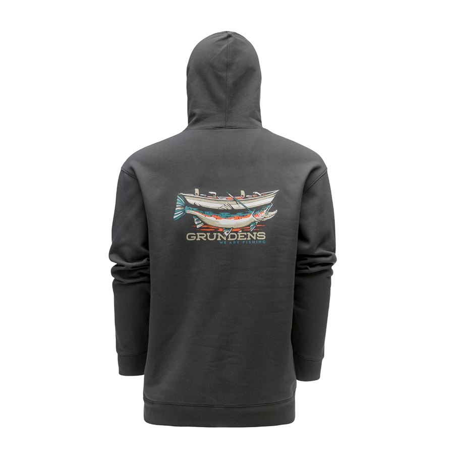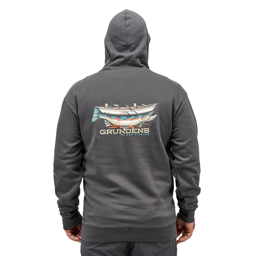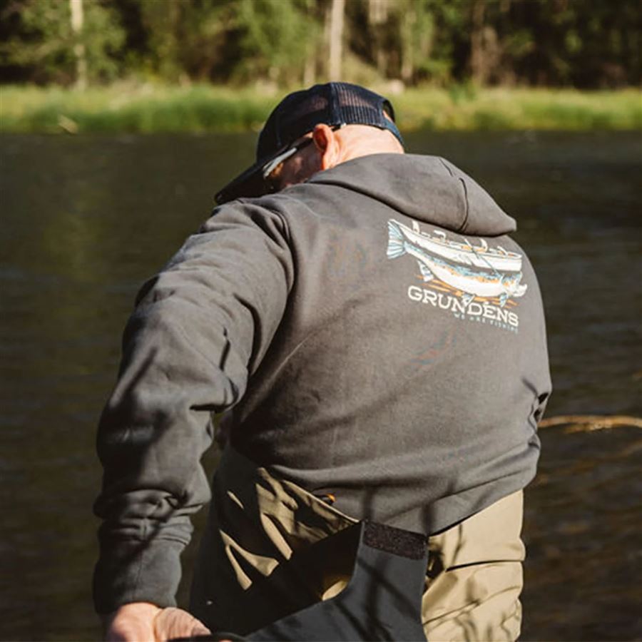 Mikina Grundéns Drift Boat Hoodie s originálnou grafikou lode a obrieho pstruha zaručene prebudí chuť hodiť „ešte ten jeden posledný nahodenie“ a uloviť riečneho obra.