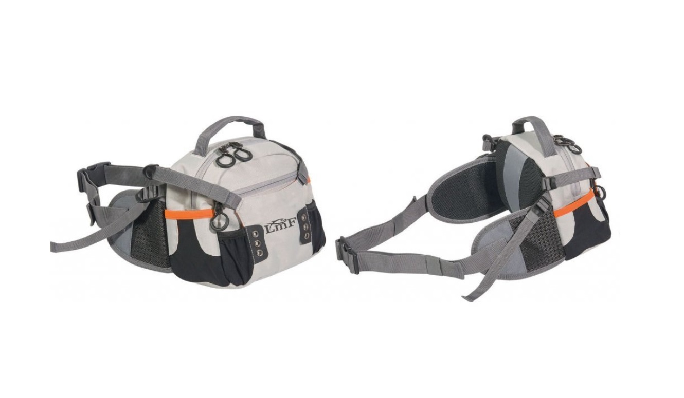 Ľadvinka Loomis and Franklin, ktorá sa dá nosiť vpredu alebo vzadu. Extrémne stabilný vďaka širokým bočným pásom, ktoré spájajú batoh s opaskom.